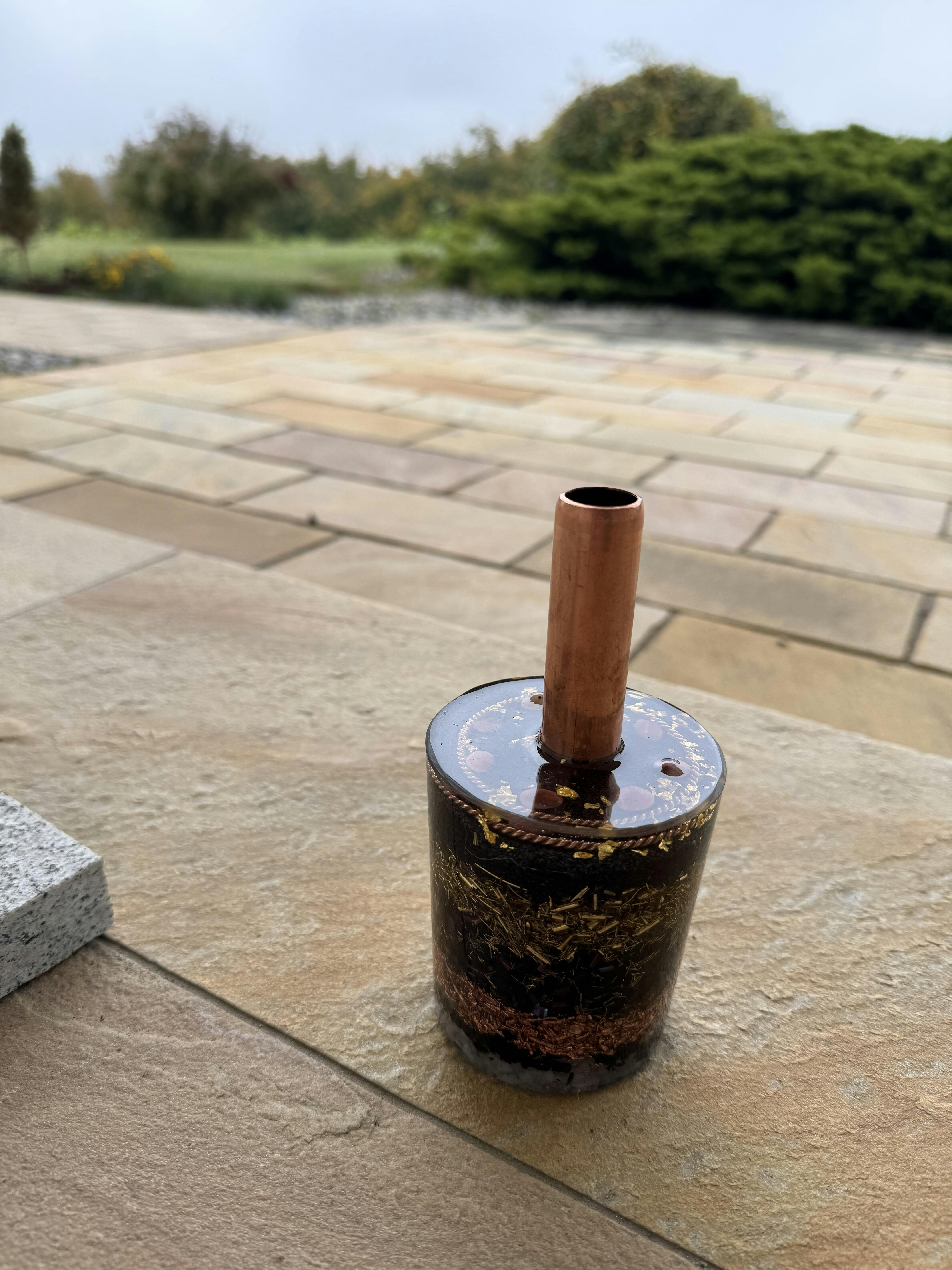 Und an dieser Stelle kann ich nur nochmal ein allerherzlichstes Dankeschön an den Tobias teilen, da er bei seinen Orgoniten nicht nur optisch ganze Arbeit geleistet hat. Die auflösende Wirkung auf die Wolkenstrukturen ist so umfassend, dass sich seither an meinem Wohnort im Essener Süden der Flugverkehr massiv erhöht hat, im Ermessen durch unaufhörliches Ausbringen weiterer Nano-Partikel den wolkenbrechenden Effekt vermeintlich ausgleichen zu wollen. Vom Frühling bis Ende August 2025 waren diese Beobachtungen in alller Deutlichkeit zu sehen und zu hören. Ich selbst habe in dieser Zeit auch gut Erfahrung in der Handhabung der Orgonite gesammelt. Bereits zu Beginn hatte ich zur Steigerung der Wirkung ein 2 Meter Kupferrohr zweigeteilt, um damit einerseits den Mini-Buster zu verlängern und mit einem Winkelaufsatz versehen auch auf die Pyramide gesetzt.