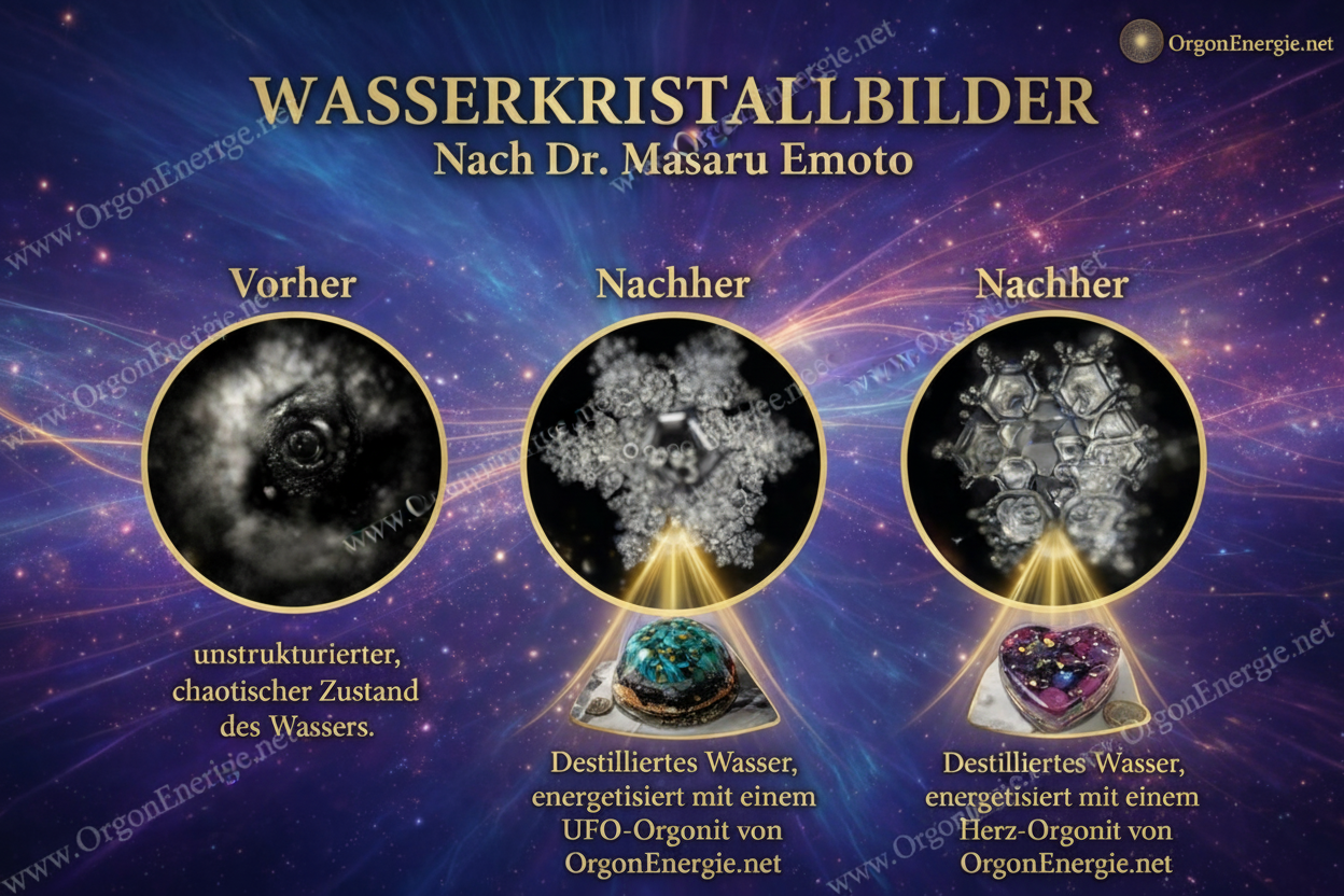 "In Untersuchungen nach der Art von Dr. Masaru Emoto bildeten Wasserproben, die mit Orgoniten von OrgonEnergie.net in Kontakt standen, deutliche hexagonale Kristallstrukturen. Diese Beobachtungen sind fotografisch dokumentiert und stellen Erfahrungswerte dar.