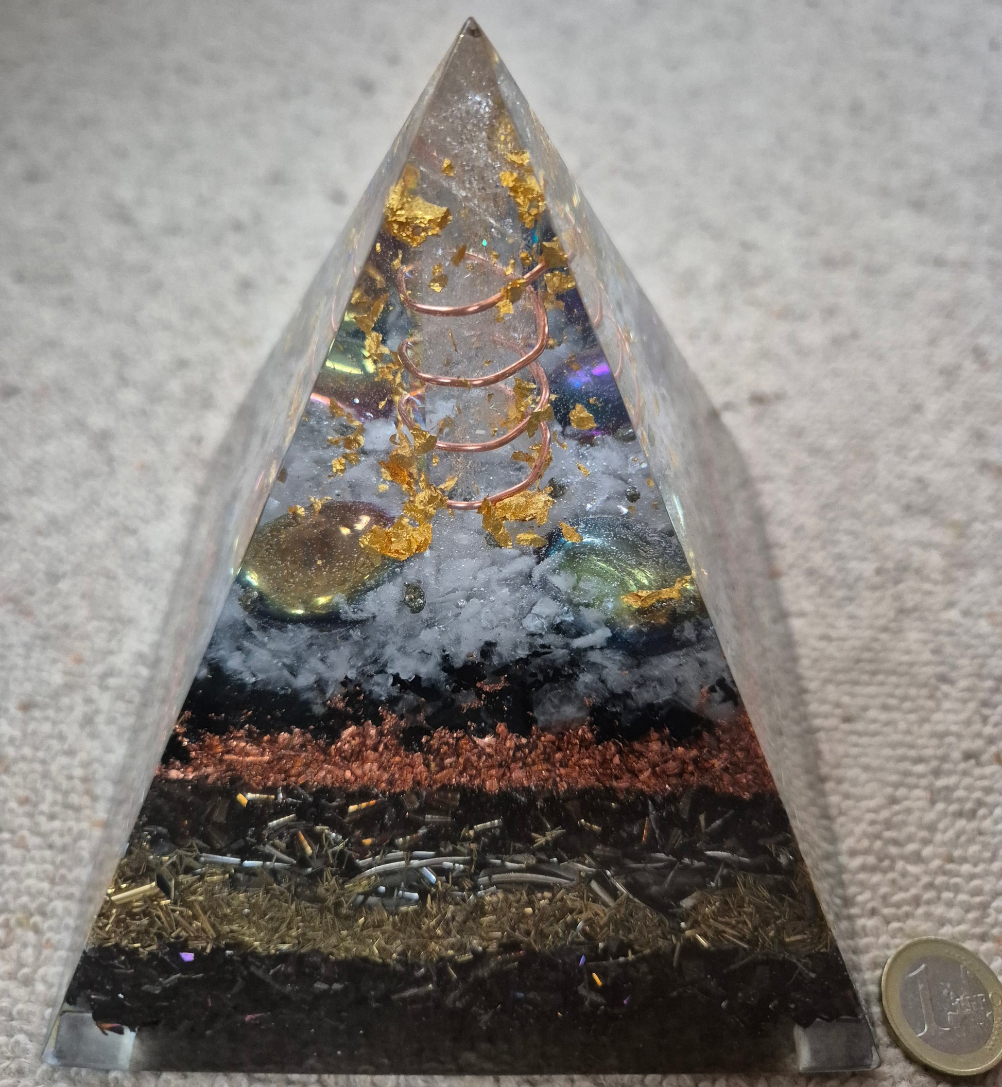 Diese einzigartige wunderschöne Orgonit-Pyramide wiegt rund 2,4 Kilogramm und eignet sich perfekt für größere Räume, in denen sie ihre volle Wirkung entfalten darf.