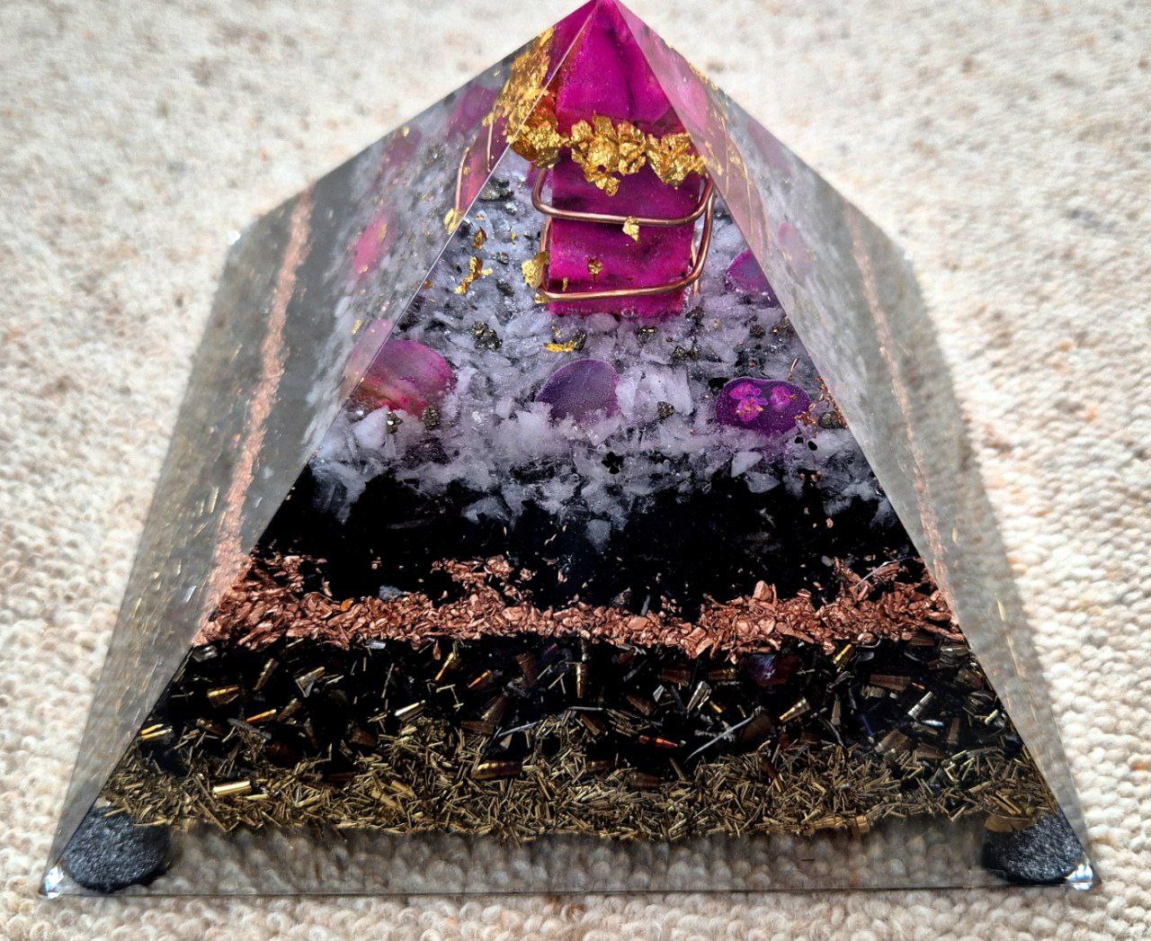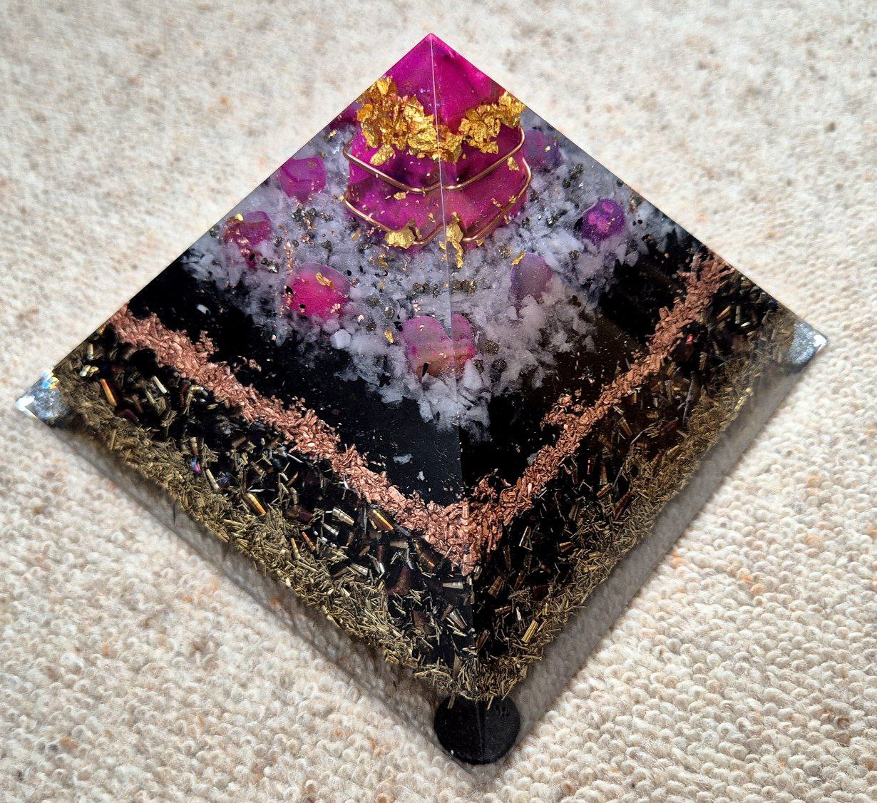 2,1 KG Orgonit Cheopspyramide im goldenen Schnitt mit 16cm Kanntenlänge und einer galvierten pinken Sphaleritkristallspitze, deswegen schimmert sie so schön - umhüllt mit reichlich 24 Karat Blattgold.