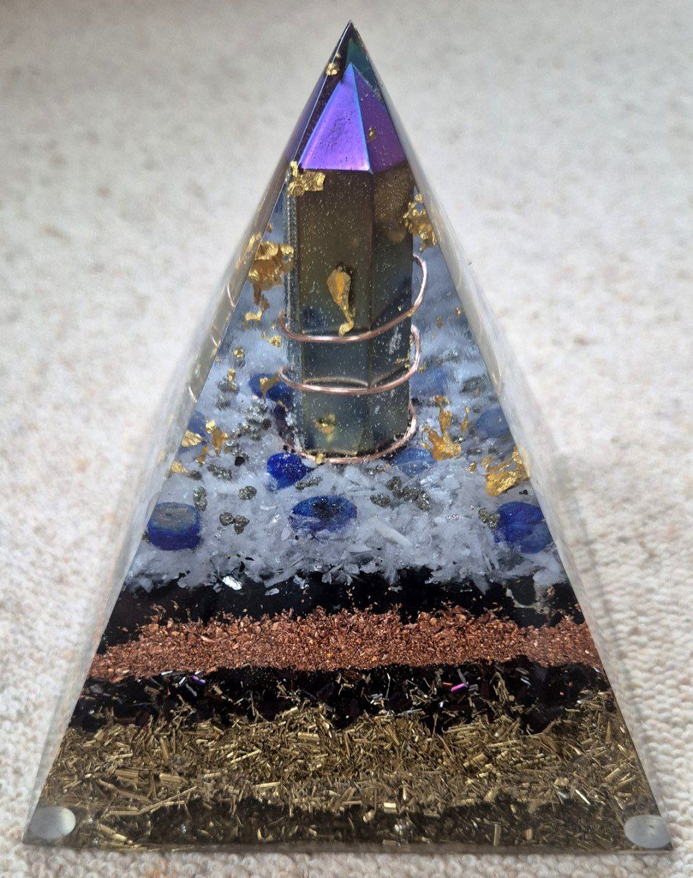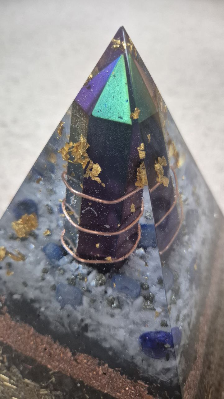 Diese einzigartige Orgonit-Pyramide wiegt rund 2,3 Kilogramm und eignet sich perfekt für größere Räume, in denen sie ihre volle Wirkung entfalten darf.